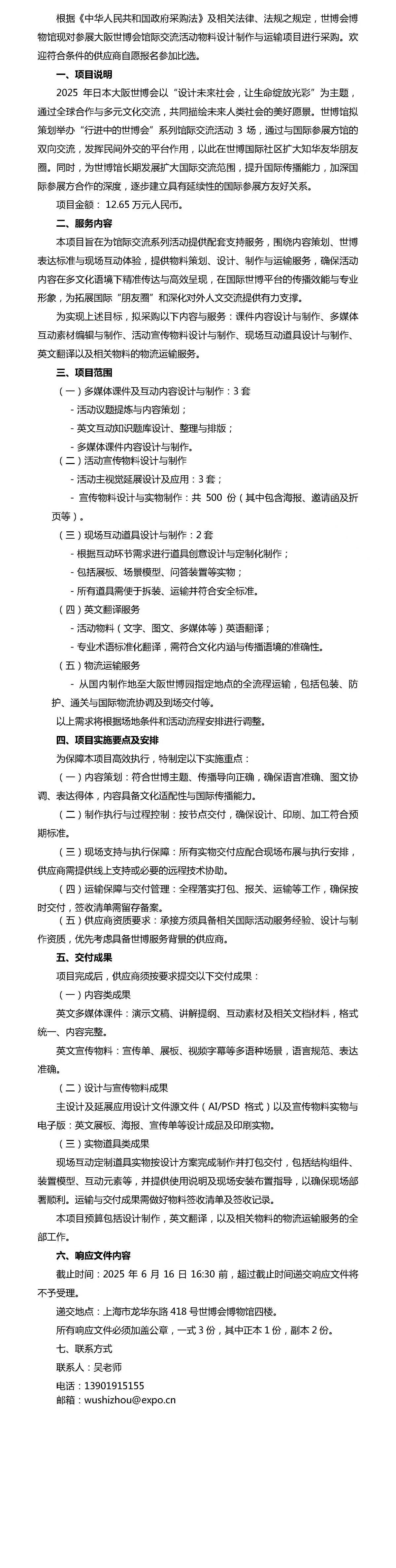 世博馆参展大阪世博会馆际交流活动物料设计制作与运输项目需求书