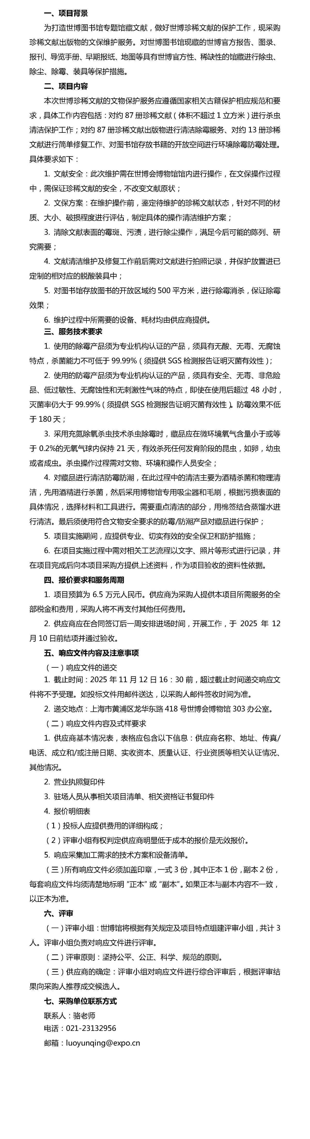 世博会博物馆图书馆珍稀文献文保维护项目采购公告
