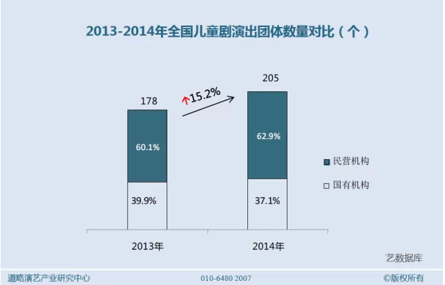 2014年国内儿童剧演出团体达到205家,同比增长15.2%。随着越来越多的民营院团和机构参与儿童剧的创作和演出,2014年国内儿童剧演出团体数量达205家,较2013年的107家增长15.2%,其中民营机构129家。