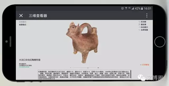 当用户到实体博物馆展厅参观,在观赏实体文物的同时,可通过微信扫描二维码,输入文物名称或数字ID等方式,实时加载数字文物模型,数字音视频讲解,观看文物故事片等,从历史、文化、工艺、习俗等各方面对文物信息进行展示,使观众更加充分的了解展览文物所蕴含的历史文化气息。