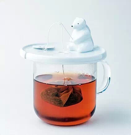 设计师将杯盖设计成了一个北极熊在捕鱼的样子,很可爱的样子。拿着的钓竿其实就是茶叶包的架子,您可以直接将茶叶包挂在上面。