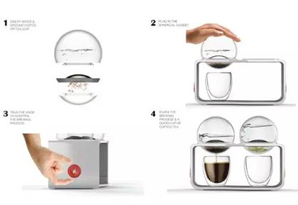 这个新概念的咖啡、茶饮机来自 Sunny Wong,饮品盛装的球星容器为硼硅玻璃材质,两个模块分别对应咖啡和茶水。需要接水的时候只要按压球面,就会有冲泡好的茶水和咖啡流出。