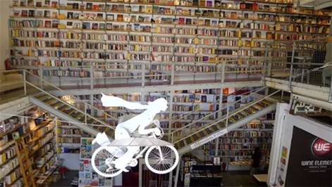 葡萄牙里斯本的这家书店,前身是挑高的工业厂房,坐拥得天独厚的室内空间,宽敞的像座停机坪。白色的墙壁缠绕着外露的管线,圆弧状的木质天花板垂挂着金属吊灯,一进店门,令人瞠目结舌的书架墙迎面而来,一楼与二楼相加陈列了超过二十层,非常壮观。若想翻阅高楼层的书,店员会搬来梯子帮你取得。由于室内全数打通,任何角度都无遮蔽物,店内景致一览无遗,其中包括一具以细线悬挂在空中、长了翅膀的飞天脚踏车骑士模型。