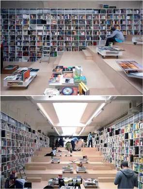 位于斯洛伐克的这家书店与咖啡厅Alexis,由Totalstudio所设计。灵活的展示空间如同演唱会表演空间的阶梯形式设计,除了方便顾客拿取、浏览、阅读之外,也提供了作为新书发表、书商活动等的场地。由低的一方进入书店,随着阶梯渐高,上方有一个小型咖啡吧,顾客可以选择随意席地而坐,阅读自己所喜爱的书籍或是来一杯咖啡放松一下。而架高的地板下方也没有浪费,不但提供了储存空间,也容纳了办公室、厕所、收银柜台等,真的是非常巧妙的商业空间设计!人们喜欢这些作为阅读和展示区域的阶梯、铺满墙面的书架和简洁的设计。
