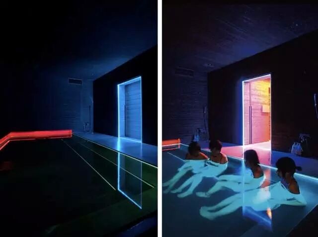 至于室内的光线,他则把重点放在了水的波光和水下的光线上。在浴池中使用了大量的光纤,让人们能在水中体验光线。下水后的效果是很炫的。