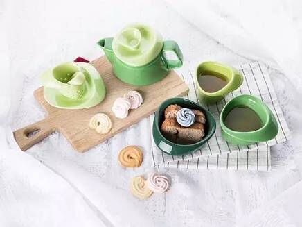 整套茶具都是用陶瓷做的,色彩绚丽,很有光泽感。
