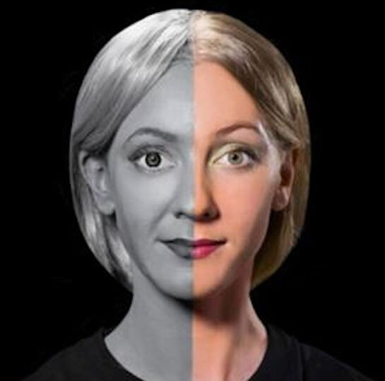 据悉,Hikaru Cho运用丙烯酸颜料在模特身上作画,受现代科技启发共创作出6张科幻人脸设计。主题为 “无线充电”的作品中,模特的脖子部分几乎完全隐形,而上方的头颅仿佛漂浮在空中一般。而在另一张名为“滑动屏幕”的作品中,模特一侧的脸颊被做出奇妙的动态感。