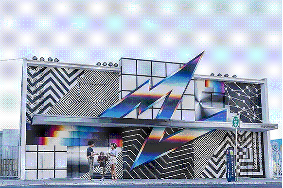 灵感来自80年代的电脑特效,阿根廷艺术家Pantone利用光谱闪电和错视画,让这栋建筑呈现出了3D的效果。