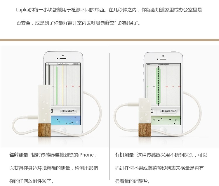 Lapka就是一套iPhone工具,包括一套可以接在iPhone上的硬件和一款对应的免费应用。 Lapka 的硬件包括四个独立的组件,分别是温度/相对湿度检测组件、电磁频率检测组件、食物有机性检测组件以及放射性检测组件这个传感器组件可以用来检测有机食品的真假或者放射性强度、温度和电磁辐射等等环境参数。由于Lapka是使用iPhone作为它的主体和电源,所以它的设计者能够大幅缩小其传感器的大小。