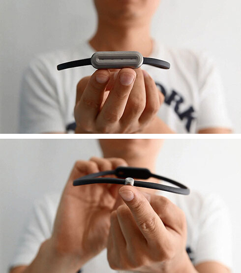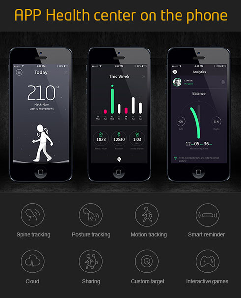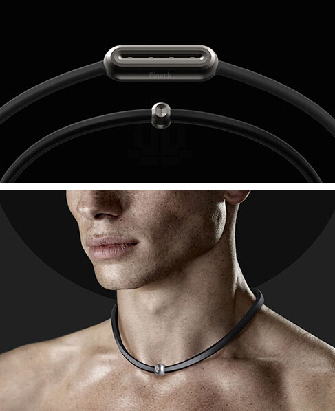 这个名叫Fineck的项圈,Fineck通过超低功耗蓝牙4.0技术与手机保持连接,记录用户的活动状态,特别针对颈椎的关爱提醒。它能够追踪颈部细微的移动动作,识别各种身体姿势,然后向用户传达身体的健康状态。当判定到颈椎有错误姿态及劳损时,Fineck会震动提醒。提醒采取情景模拟方式,先用数据告诉你颈部状态,然后建议你“抬头看天边云彩”。