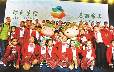 昨晚,延庆八达岭长城望京广场灯火辉煌,蜿蜒的八达岭长城在灯光的照射下,多了几分妩媚动人。晚上8时许,一位舞者出现在舞台中央,在身后的画布上随着音乐起舞。不久,画布上就出现了一对中国风格显著、园艺特色鲜明的“金童玉女”形象。渐渐地,两个娃娃由黑白变成彩色,并在画布上欢快地舞蹈,北京世园会的吉祥物形象逐渐清晰。随后,在两个可爱的吉祥物娃娃的引领下,世园局负责人走上舞台,手持花洒“浇灌”着含苞待放的花朵,得到滋润的鲜花瞬间绽放,北京世园会会徽——“长城之花”在舞台大屏幕上绚丽呈现。六片不同颜色的花瓣围绕长城翩翩起舞,生动呈现了“长城脚下世园会”的特色,也象征世界各国人民共赴园艺盛会。