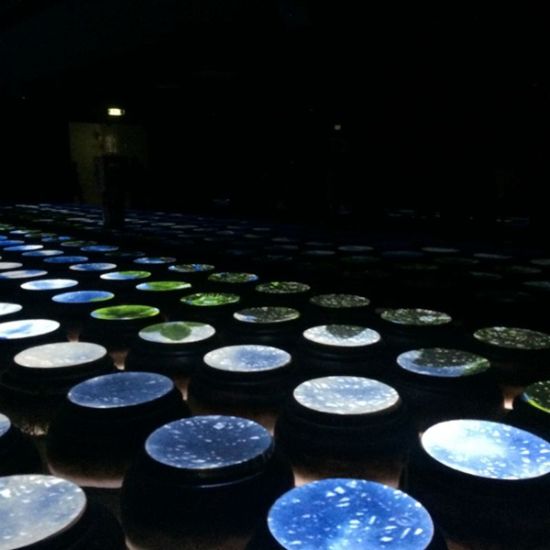 一个全部黑暗的展厅中,地上摆满泡菜坛子(其实是一个个圆形的多媒体屏幕),伴随音乐,从头到尾走一圈,感觉还是挺新奇的。